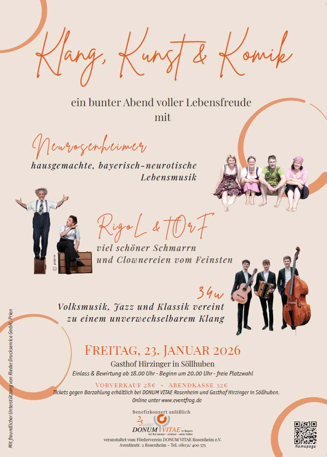 Am Freitag, den 23.01.2026, lädt der Förderverein von DONUM VITAE Rosenheim anlässlich des 25-jährigen Bestehens der staatlich anerkannten Beratungsstelle zu einem Benefizkonzert der besonderen Art ein.