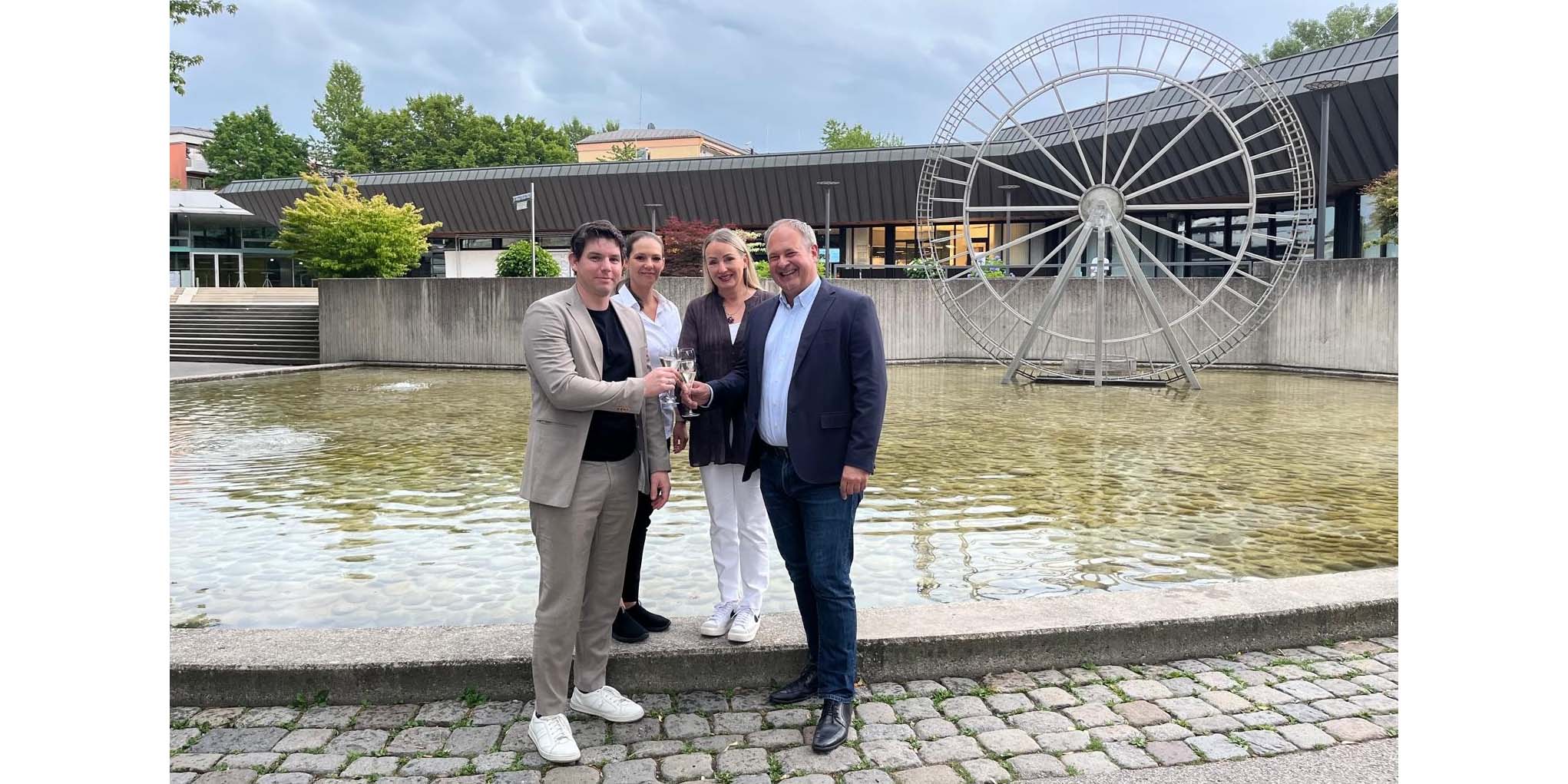 Foto ©VKR: „Stoßen vor dem KU’KO auf die erneute Zusammenarbeit an“: Florian Englert (Geschäftsführung VKR), Caroline Knittel (Gastroleitung im KU’KO), Susanne Baumgartner (Leitung KU’KO), Andreas Schmidt (Geschäftsführung Prinzipal)