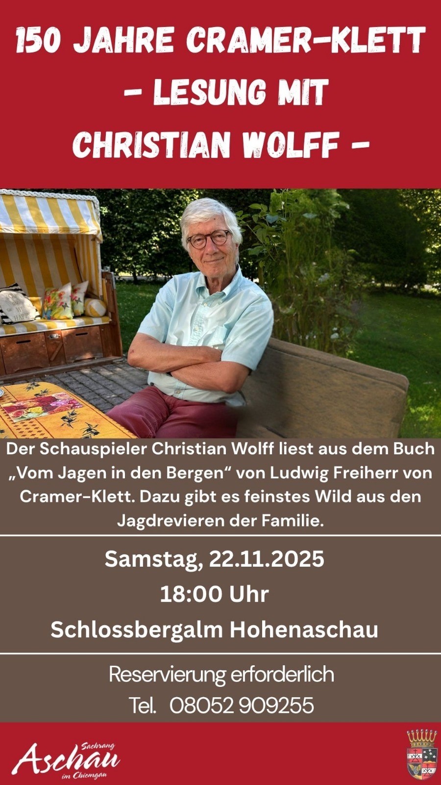 Mit dem Ende des Jahres 2025 schließt sich auch ein besonderes Kapitel Aschauer Geschichte: 150 Jahre Freiherrliche Familie von Cramer-Klett. Zum feierlichen Ausklang dieses Jubiläumsjahres lädt die Tourist Info Aschau i.Chiemgau am Samstag, 22. November, ab 18 Uhr, zu einem außergewöhnlichen Abend in die Schlossberg Alm Hohenaschau ein – eine harmonische Verbindung aus Literatur, Geschichte, Musik und feiner Kulinarik. Der Aschauer Schauspieler Christian Wolff liest an diesem Abend ehrenamtlich für seine Heimatgemeinde aus den originalen Jagdaufzeichnungen von Baron Ludwig von Cramer-Klett. Mit seiner eindrucksvollen Stimme erweckt Wolff die Jagderlebnisse vergangener Zeiten zum Leben und entführt die Zuhörer in die Welt des Barons – zwischen Naturverbundenheit, Jagd und Tradition.