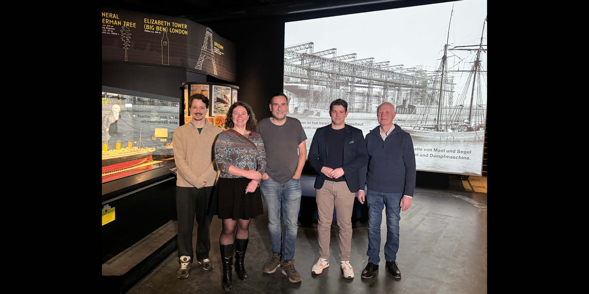 Foto (von links): Aaron Jungblut-Klemm, Atelier Hammerl und Dannenberg, Dr. Jennifer Morscheiser, Leiterin des Lokschuppen Rosenheim, Günter Bäbler, Vorstand des Titanic Verein Schweiz und fachlicher Berater, Florian Englert, Geschäftsführer der Veranstaltungs- und Kongress GmbH Rosenheim, sowie Dr. Peter Miesbeck, Kurator und ehemaliger Leiter des Lokschuppen Rosenheim.